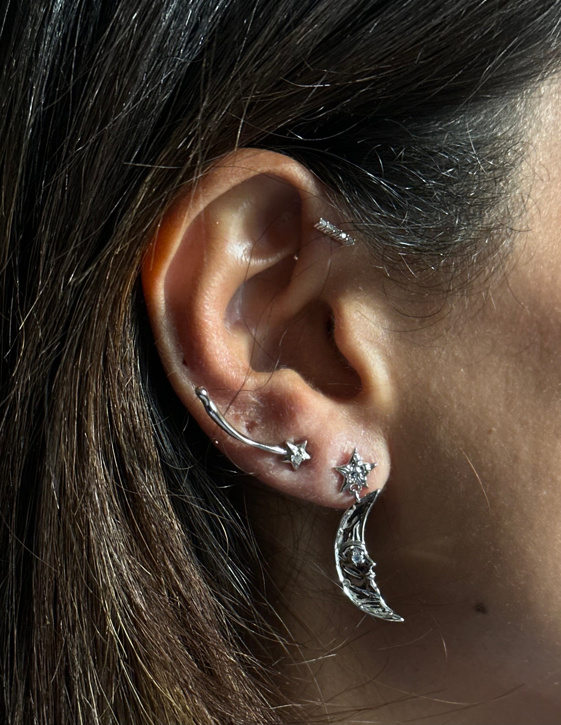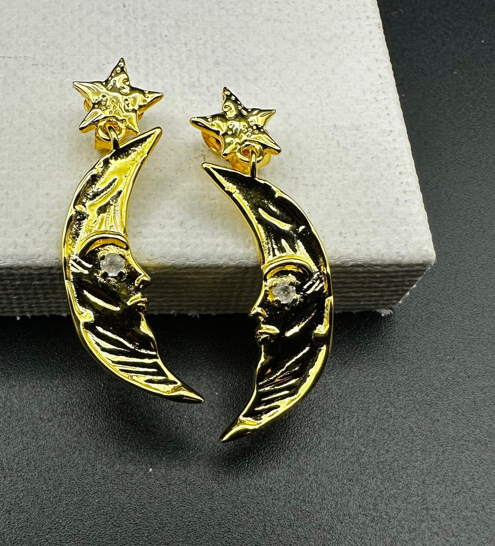 star and crescent earrings with facial details and a small diamond